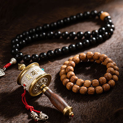 Our Tibetan Jewelry: Mala, Wooden bracelet, prayer wheel & Thangka. Embody authentic Tibet's serenity.