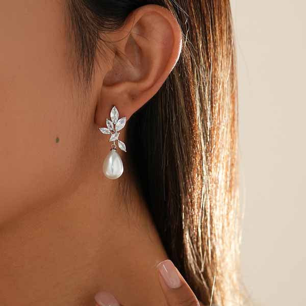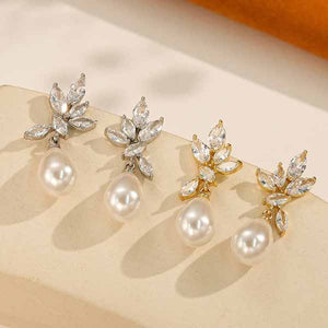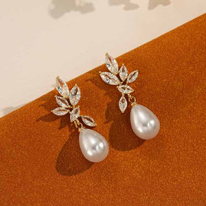 Freshwater Pearl Earrings Drop | Diamond Leaves Earrings | Plated Gold or Silver