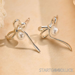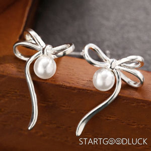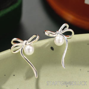 Ribbon Bow Earrings |Ribbon Earrings | Silver Pearl Drop Earrings
