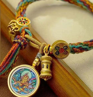 This Tibetan - style hand - braided bracelet features a vibrant five - color cord, a round Yellow Jambhala thangka pendant, a golden prayer wheel, and enamel - inlaid beads. In Tibetan Buddhism, Yellow Jambhala is the deity of wealth, luck, and wisdom—wearing this bracelet is believed to attract prosperity, bring good fortune, and enhance spiritual insight.
