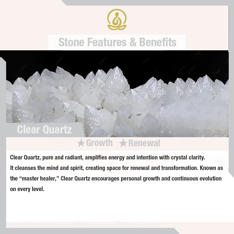 Clear Quartz, pure and radiant, amplifies energy and intention with crystal clarity. It cleanses the mind and spirit, creating space for renewal and transformation. Known as the “master healer,” Clear Quartz encourages personal growth and continuous evolution on every level.