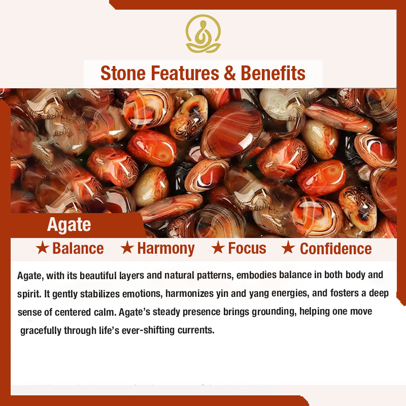 Agate, with its beautiful layers and natural patterns, embodies balance in both body and spirit. It gently stabilizes emotions, harmonizes yin and yang energies, and fosters a deep sense of centered calm. Agate’s steady presence brings grounding, helping one move gracefully through life’s ever-shifting currents.