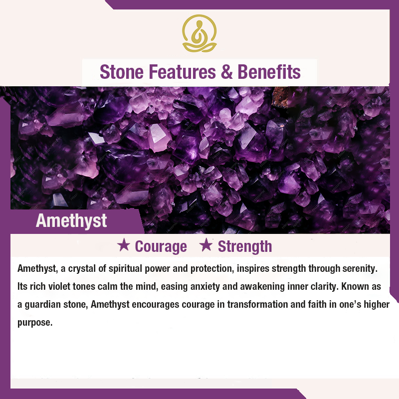 Amethyst, a crystal of spiritual power and protection, inspires strength through serenity. Its rich violet tones calm the mind, easing anxiety and awakening inner clarity. Known as a guardian stone, Amethyst encourages courage in transformation and faith in one’s higher purpose.