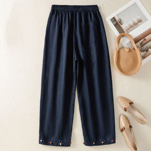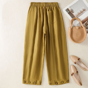 Women Solid Color Slimming Casual Elastic Waist Wide-leg Pants with Embroidered Beads