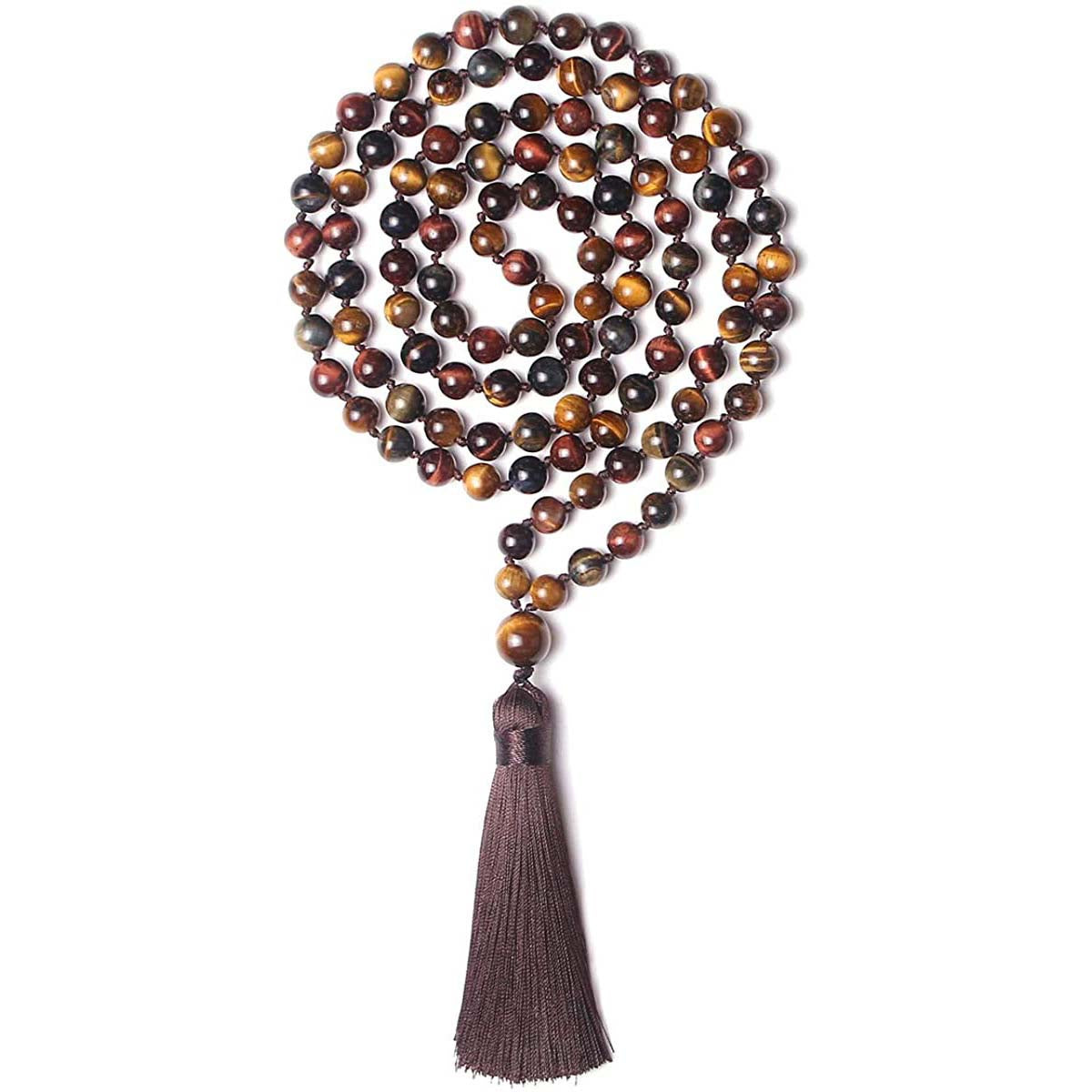 Tibetan 108 - Bead Three - Color Tiger’s Eye & Obsidian Mala Necklace: Ward Off Negativity, Attract Fortune
