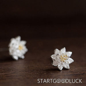 These 925 Sterling Silver Lotus Flower Balance Earrings are exquisitely crafted as lotus-shaped studs, featuring delicate silver petals with golden centers, and they embody Buddhist symbolism for spiritual purification, good fortune, and soul healing.