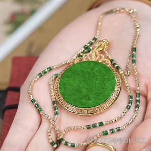 This Green Agate Necklace is a stunning piece of gold - adorned green agate jewelry. Featuring a vivid green agate pendant encircled by intricate gold detailing, paired with a chain that blends gold and green accents, it’s a standout accessory that merges luxury with cultural charm.