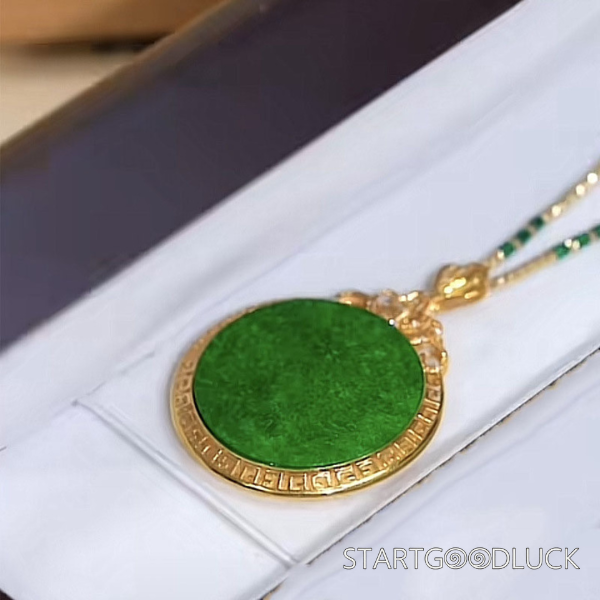 Crafted with vibrant green agate, the pendant boasts a rich hue that exudes natural elegance. The surrounding gold detailing, with its intricate patterns, adds a touch of luxury. The chain, combining gold and green elements, complements the pendant perfectly. The overall design is versatile, easily matching with various styles—from casual everyday outfits to more formal attire—adding an element of oriental grace.