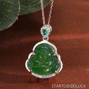 This is a stunning jade and silver buddha pendant, showcasing a meticulously carved laughing Buddha figure hewn from premium jade and elegantly set in polished silver. Adorned with glistening decorative accents, it’s not just a piece of jewelry but a harmonious blend of artistic beauty and profound spiritual allure.