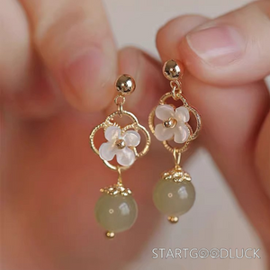 These Jade Flower Earrings showcase an authentic design centered around natural jade, merging elegant style with spiritual significance deeply rooted in Buddhist culture.