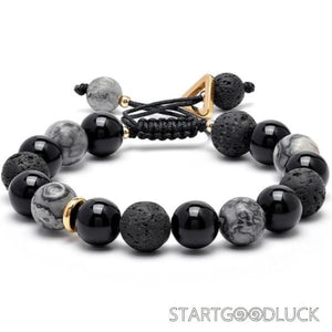 Made with glossy obsidian and textured lava rock stones, the bracelet showcases a naturally striking contrast—obsidian’s smooth surface is thought to protect against negativity and attract wealth, while lava rock’s porous texture absorbs harmful energies. This makes the piece not only visually appealing but also metaphysically powerful.