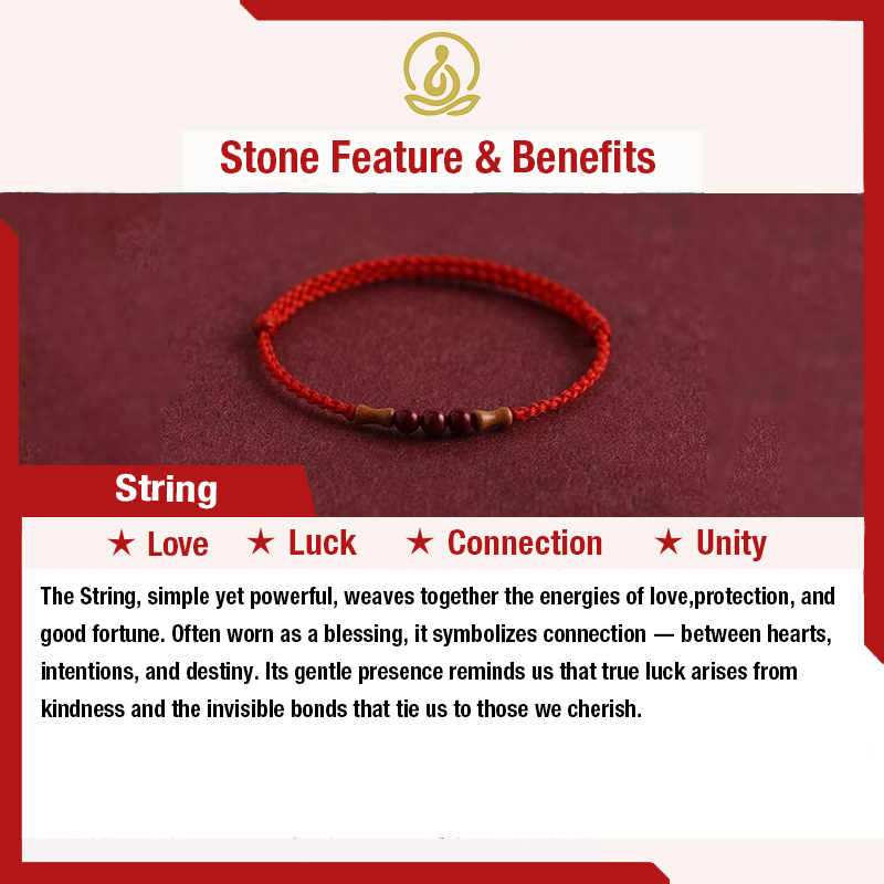 The String, simple yet powerful, weaves together the energies of love, protection, and good fortune. Often worn as a blessing, it symbolizes connection — between hearts, intentions, and destiny. Its gentle presence reminds us that true luck arises from kindness and the invisible bonds that tie us to those we cherish.