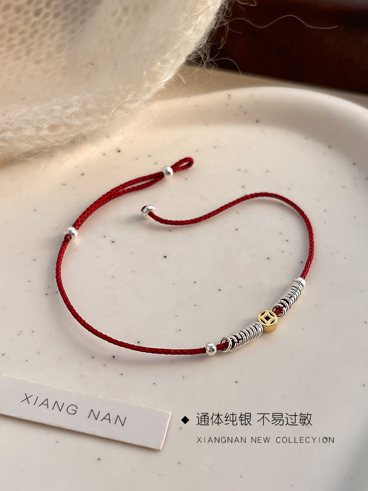 This is a Silver Coin Red Rope Bracelet, a niche - designed new Chinese - style cultural and creative bracelet. It is made of sterling silver coins and red cord. The sterling silver coins, engraved with traditional patterns, inherit the cultural significance of silver in Chinese tradition as a symbol of auspiciousness and protection, and the fine silver - making craft ensures their delicate texture. The red cord, a classic element in Chinese culture representing good luck and joy, is skillfully woven to fit various wrist sizes for daily wear. This bracelet blends the elegance of traditional silver art with modern niche design, making it a perfect gift to convey wishes of good fortune and a unique style, embodying both cultural heritage and contemporary charm.
