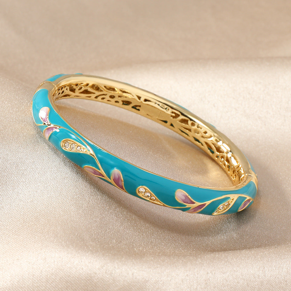 This is a Cloisonne Enamel Copper Bracelet, a retro - style Chinese cultural. It is made of copper, enamel, and inlaid crystals. The copper base, with a long history in Chinese traditional jewelry making, is processed through exquisite cloisonne enamel craftsmanship—where tiny metal wires form compartments filled with colorful enamel glazes, creating vivid and durable patterns. This craftsmanship inherits the royal aesthetic of ancient China, making each bracelet a work of art. The enamel colors are rich and bright, symbolizing prosperity and good fortune in Chinese culture. Suitable for daily wear or special occasions, this bracelet is a perfect gift to convey wishes of elegance and lasting fortune, blending time - honored cultural heritage with contemporary fashion appeal.