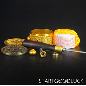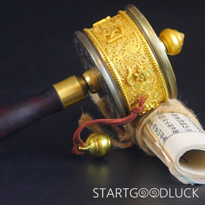 Dark Wooden Handle: Crafted from premium hardwood (likely padauk or rosewood), it offers a smooth, non - slip grip for easy spinning. The wood’s rich color contrasts beautifully with the gold, adding to its sacred aesthetic.