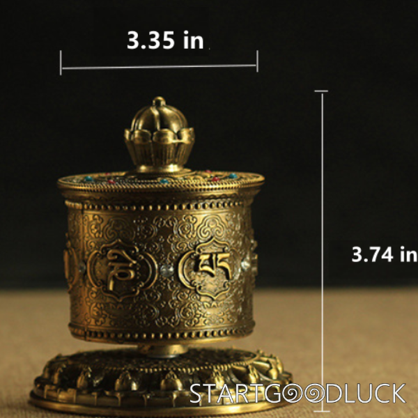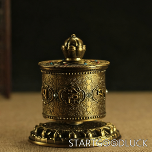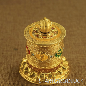 This Tibetan Prayer Wheel is a tabletop design, crafted from gold - plated copper. It features intricate carvings of the “Oṃ Maṇi Padme Hūṃ” mantra, inlaid with turquoise and red gemstones, topped with a lotus - shaped finial, and set on a lotus - patterned base. In Tibetan Buddhism, spinning this wheel is a sacred practice to accumulate spiritual merit — each rotation is equivalent to reciting the mantra thousands of times, making it a powerful tool for blessing homes, offices, or meditation spaces.