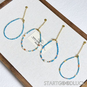 Centered on vibrant blue apatite beads (evoking ocean-like calm), these dainty beaded bracelets blend in playful touches: some styles mix tiny colorful crystal beads (orange, purple, yellow hues) or glossy pearls, while all pair with gold-plated chains/clasps. Wear them solo for minimalist charm or stack multiple for a boho layered vibe—each design balances tranquility and whimsy.