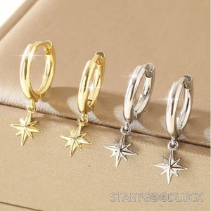 These are Eight Awn Star Pendant Earrings, featuring plated gold or silver options and serving as versatile basic clothing items.