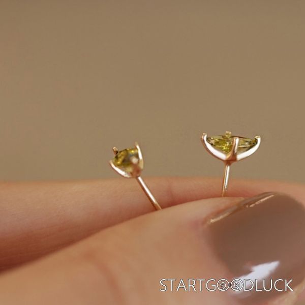 The Olive Green Stone Earrings come in a lovely olive green hue. They are perfect for both single wear to add a subtle touch to your look and can also be easily incorporated into a layered earring style. Each earring showcases a single, beautifully cut olive green stone, giving them a minimalist charm.