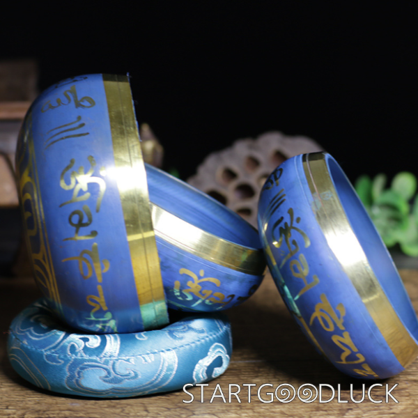 Featuring exquisite Tibetan-inscribed craftsmanship, the bowl showcases traditional Tibetan artistry. The golden Tibetan characters on the blue surface not only add to its aesthetic appeal but also are believed to carry sacred meanings that can purify thoughts and enhance spiritual connections.